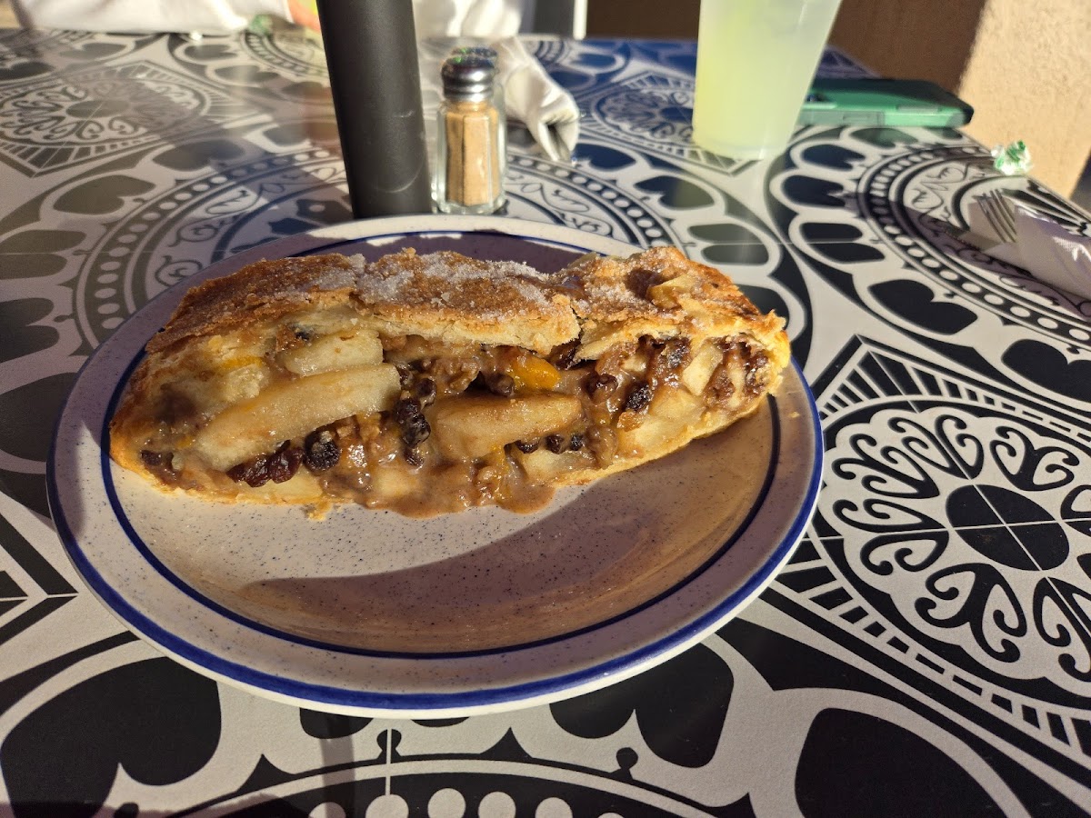 This place has everything!! Outdoor seating! Breakfast! Mexican food! Bakery! Fresh fruit! Cappuccino! Non-milk options! Visiting from TX and we stumbled upon The New Baking Co (only place open before 8 am on Google map) for breakfast on the way to the airport. Their coffee is great, they have your typical kids menu and the Pueblo pie was SO GOOD. I have been missing out all my life! It's a flaky pie-like pastry filled with apples, peaches, pecans, walnuts, and raisins (don't worry, there are very few raisins!) dusted with sugar and probably has some cinnamon. It was GREAT with coffee! Nearly gone before the cappuccino was done being made